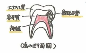 歯の象牙質には、象牙細管という菅がたくさんあります。この菅には、神経までトンネル状につながっているため、何らかの原因で象牙質が露出すると刺激が神経に伝わり痛くなる事があり、これを知覚過敏といいます。
